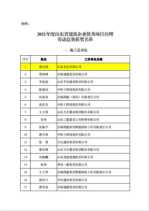 近日,由山东省建设工会和山东省建筑业协会组织开展的《2021年度山东省建筑企业优秀项目经理劳动竞赛活动》落下帷幕,经双方组成的工作委员会评议审定和综合评审,我环亚官方网站苗元亮、卢正雷、蔡国森三名同志被评为“山东省建筑企业优秀项目经理”。此项殊荣是山东省建筑行业项目经理的最高荣誉,旨在鼓励受表彰人员再接再厉,发挥引领示范作用,创建更多精品工程。