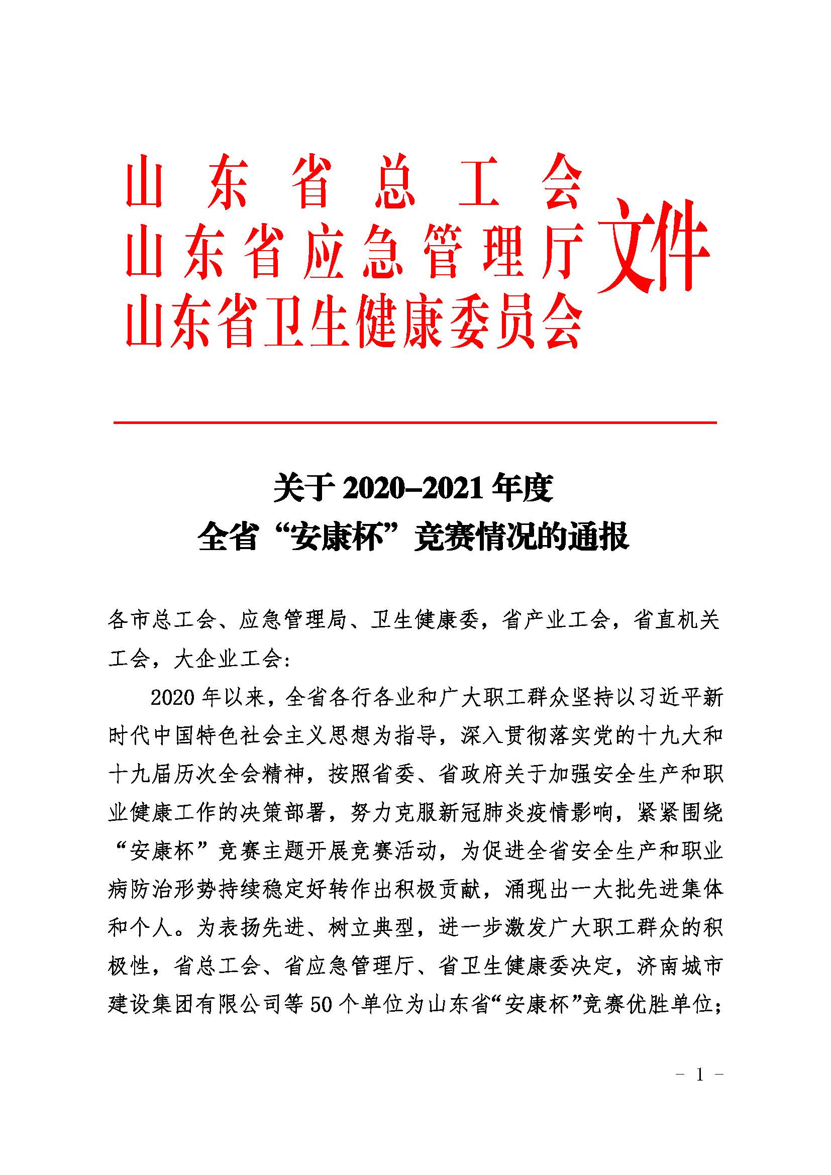 近日,山东省总工会、山东省应急管理厅和山东省卫生健康委员会联合印发文件,通报了2020-2021年度全省“安康杯”竞赛活动结果,环亚官方网站荣获全省“安康杯”竞赛优胜单位称号。