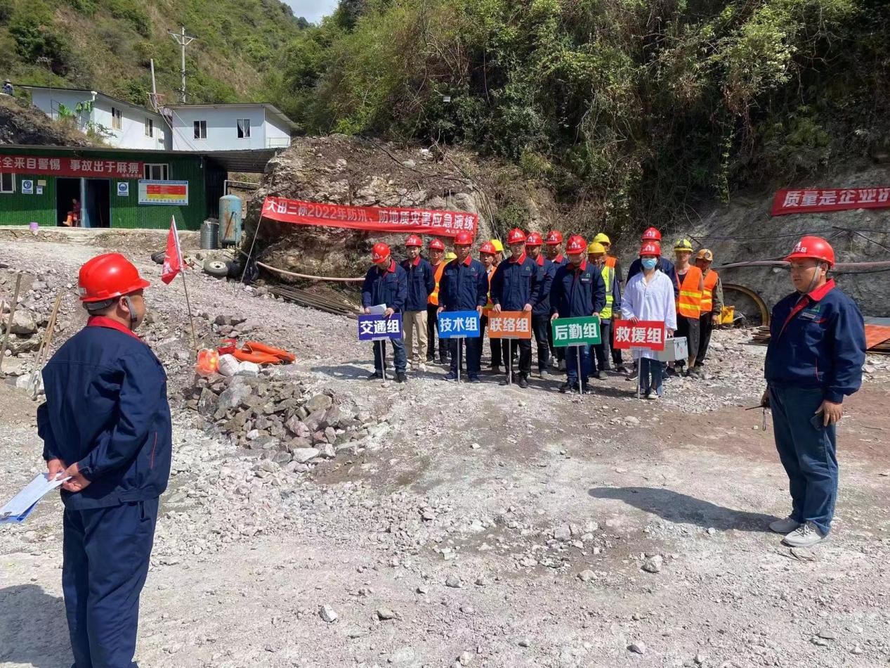 本次演练以庙基坪改线隧洞进口工作面“突遇强降雨爆发山洪”为演练背景,按照应急方案,先后通过信息报告及预警、应急预案的启动、各救援小组紧急集合、现场人员的紧急疏散、施工现场的应急抢险、现场伤员救护等方面展开。
